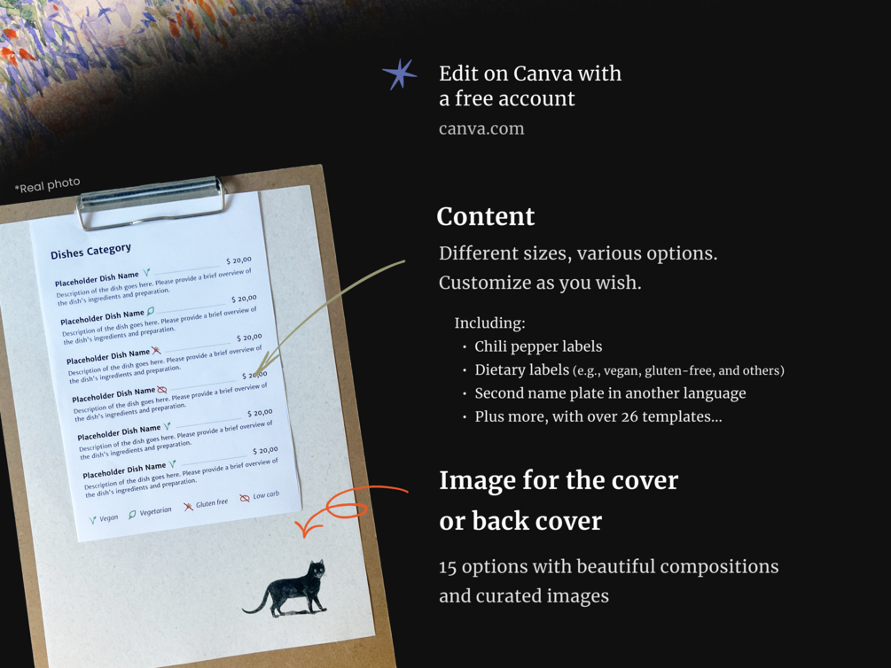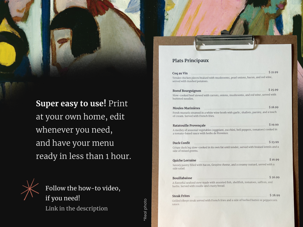 These templates are easy to use and can be printed right at home, allowing you to have your menu ready in just a few hours.