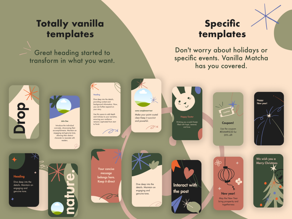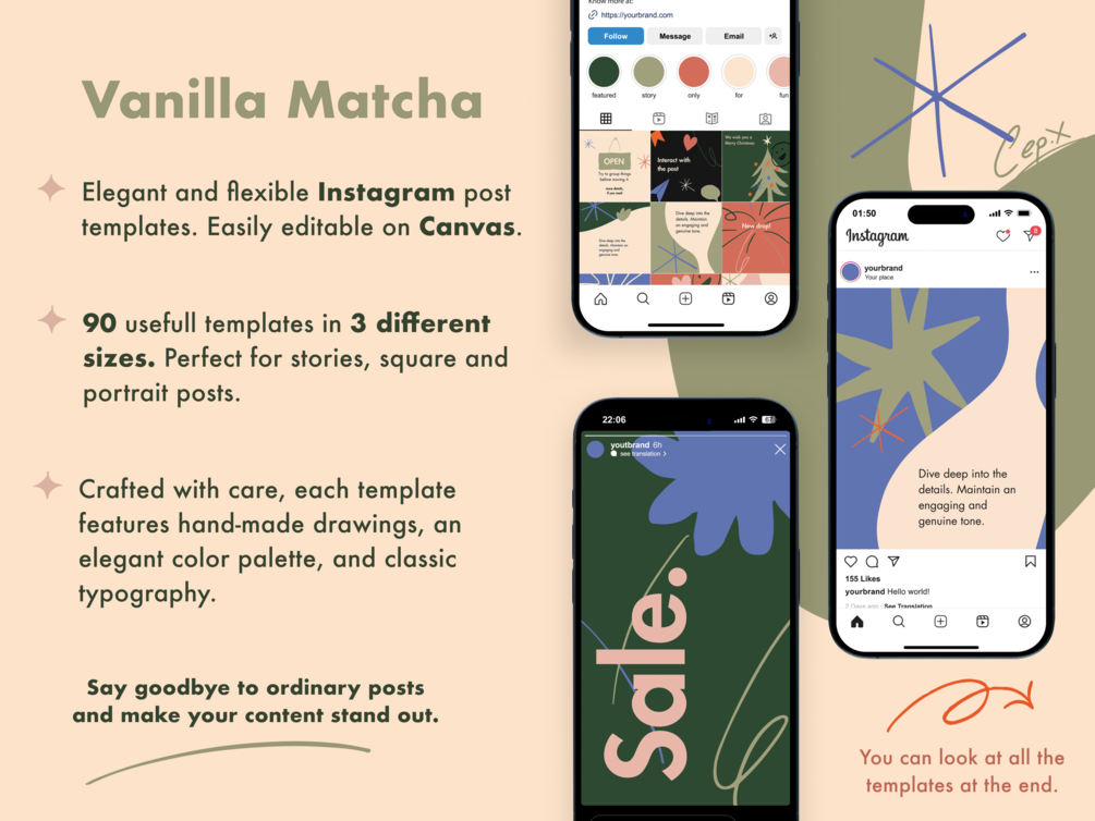 ꕥ Crafted with care, each template features hand-made drawings, an elegant color palette, and classic typography. Say goodbye to ordinary posts and make your content stand out.