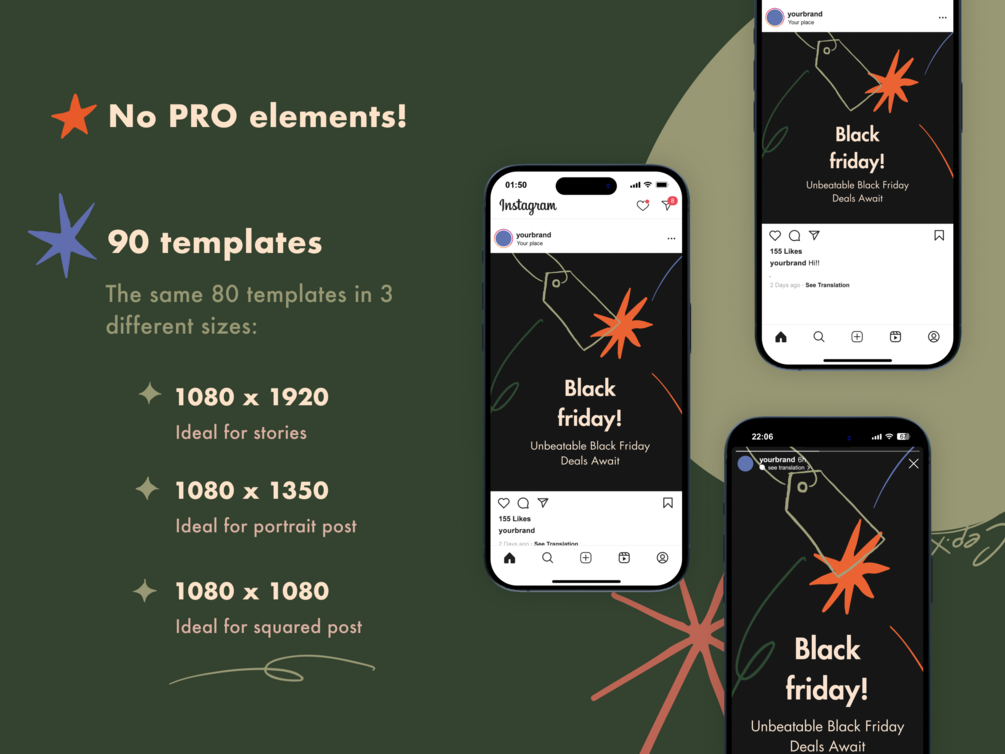 ⌘ 90 templates in 3 different sizes, perfect for posts, square canvases, and portrait formats.